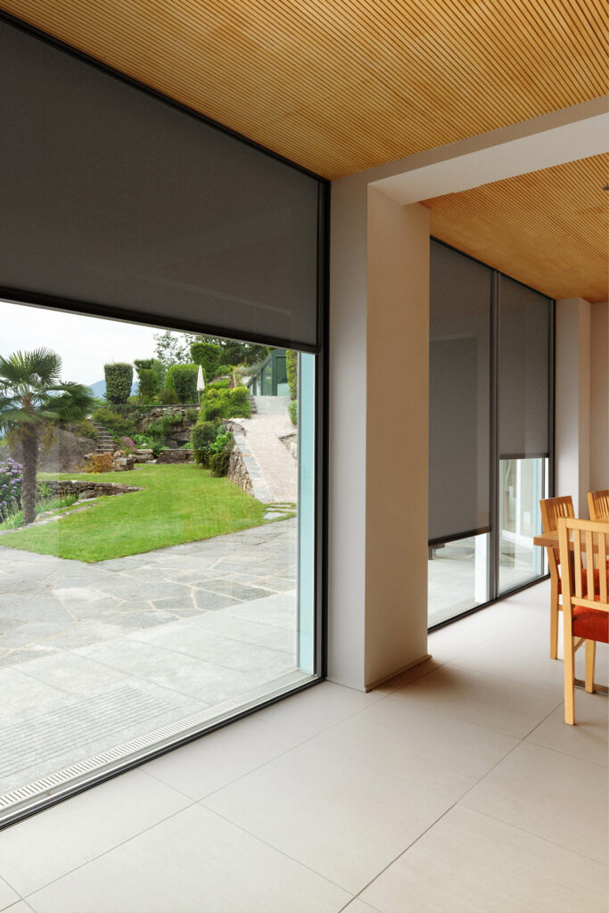 Modern screen with a mosquito net function and a privacy filter. Transparency to choose from, colors to match – ideal for large glazings.