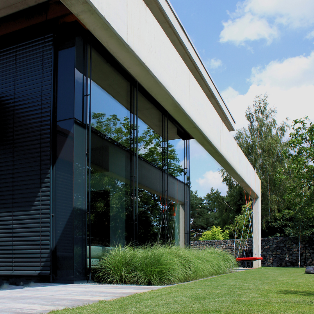 These structures create an impression of lightness, emphasize the modern character of the building, and ensure visual consistency across the entire facade. This solution is very popular in modern single-family house projects, as well as in office buildings, exhibition and conference centres, and commercial facilities.