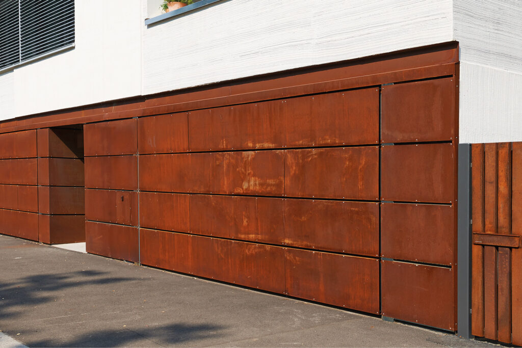 Porte invisible qui s’intègre à la façade. Grâce à des matériaux assortis, elle crée un ensemble cohérent avec l’élévation – une entrée élégante pour le garage et la maison.